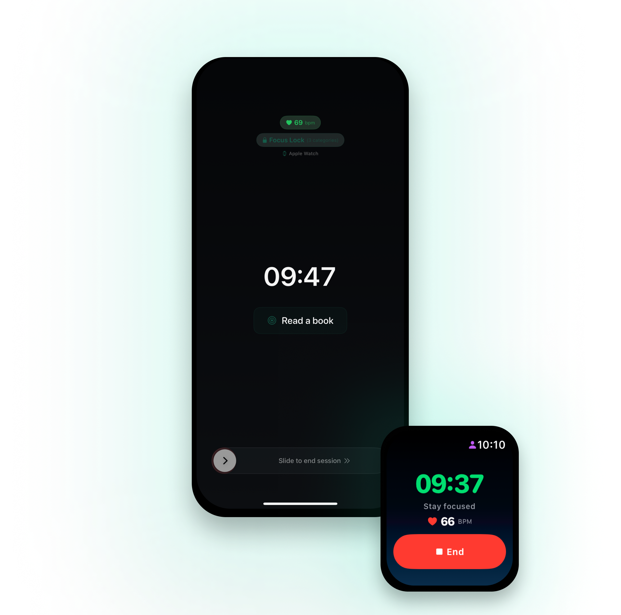 Launch sessions from your wrist and get real-time heart rate monitoring. Receive gentle haptic alerts when heart rate patterns suggest your focus may be drifting—helping you stay on track without checking your phone.